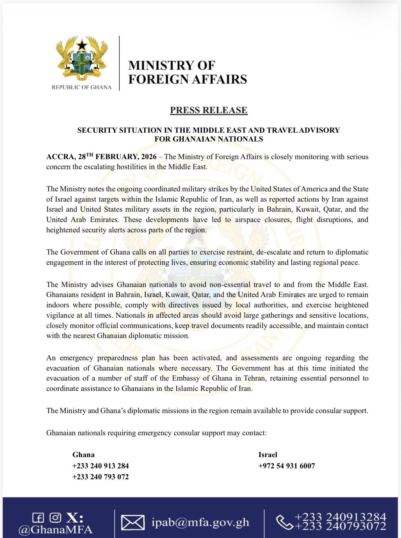 The Ministry disclosed that an emergency preparedness plan has been activated, with ongoing assessments regarding the possible evacuation of Ghanaian nationals if necessary. It confirmed that the Government has initiated the evacuation of a number of staff of the Embassy of Ghana in Tehran, while retaining essential personnel to coordinate assistance to Ghanaians residing in the Islamic Republic of Iran.