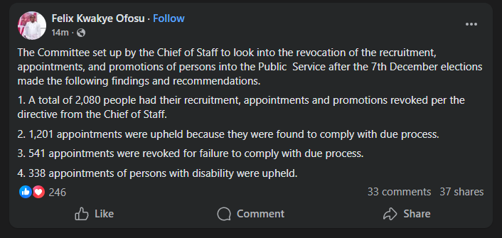 In a Facebook post, Mr. Kwakye Ofosu explained that the committee, constituted by the Chief of Staff, was asked to scrutinise all appointments affected by the earlier directive and determine which met established procedures.