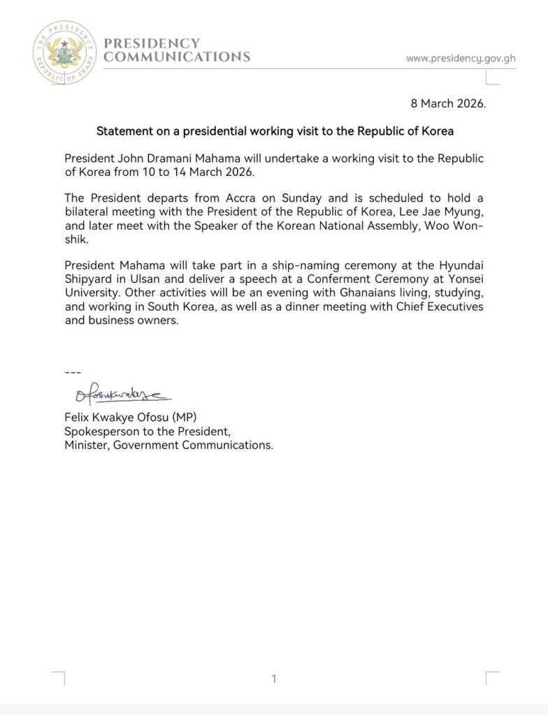 President John Dramani Mahama is set to embark on a five-day working visit to South Korea from March 10 to March 14 to strengthen bilateral relations between the two countries.