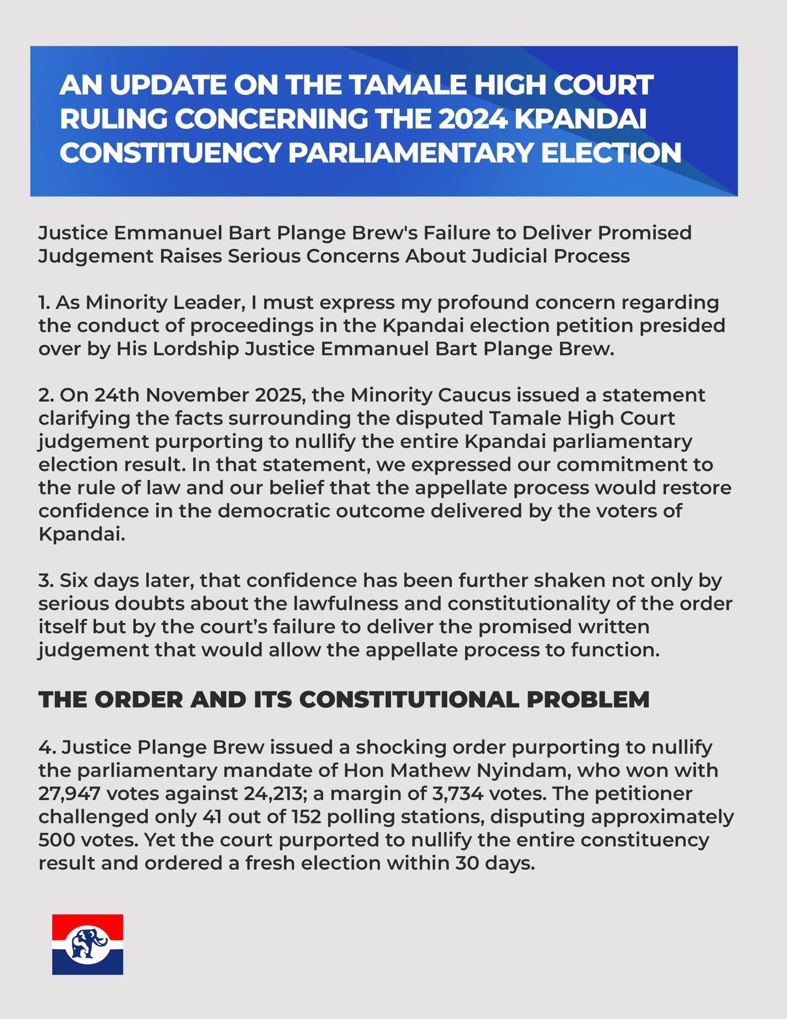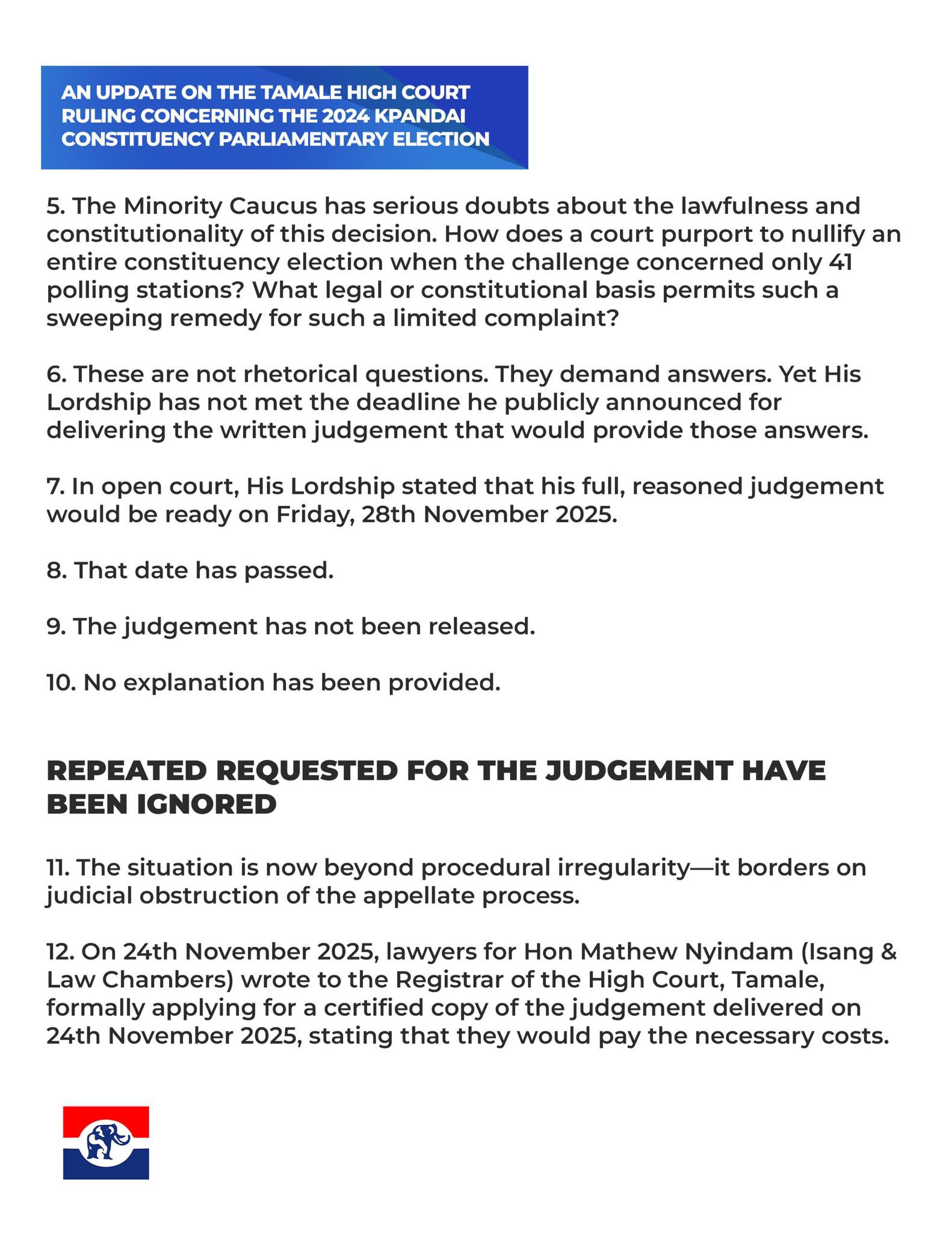 In a statement, the Minority Leader explained that the judge promised to release the full judgment on November 28, 2025, but failed to do so.
