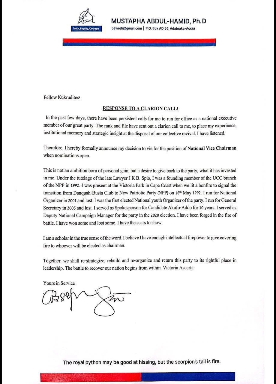 In a statement titled "Response to a Clarion Call," Dr. Abdul-Hamid revealed that his decision follows persistent appeals from the party’s rank and file to leverage his "institutional memory and strategic insight" for the NPP's collective revival.