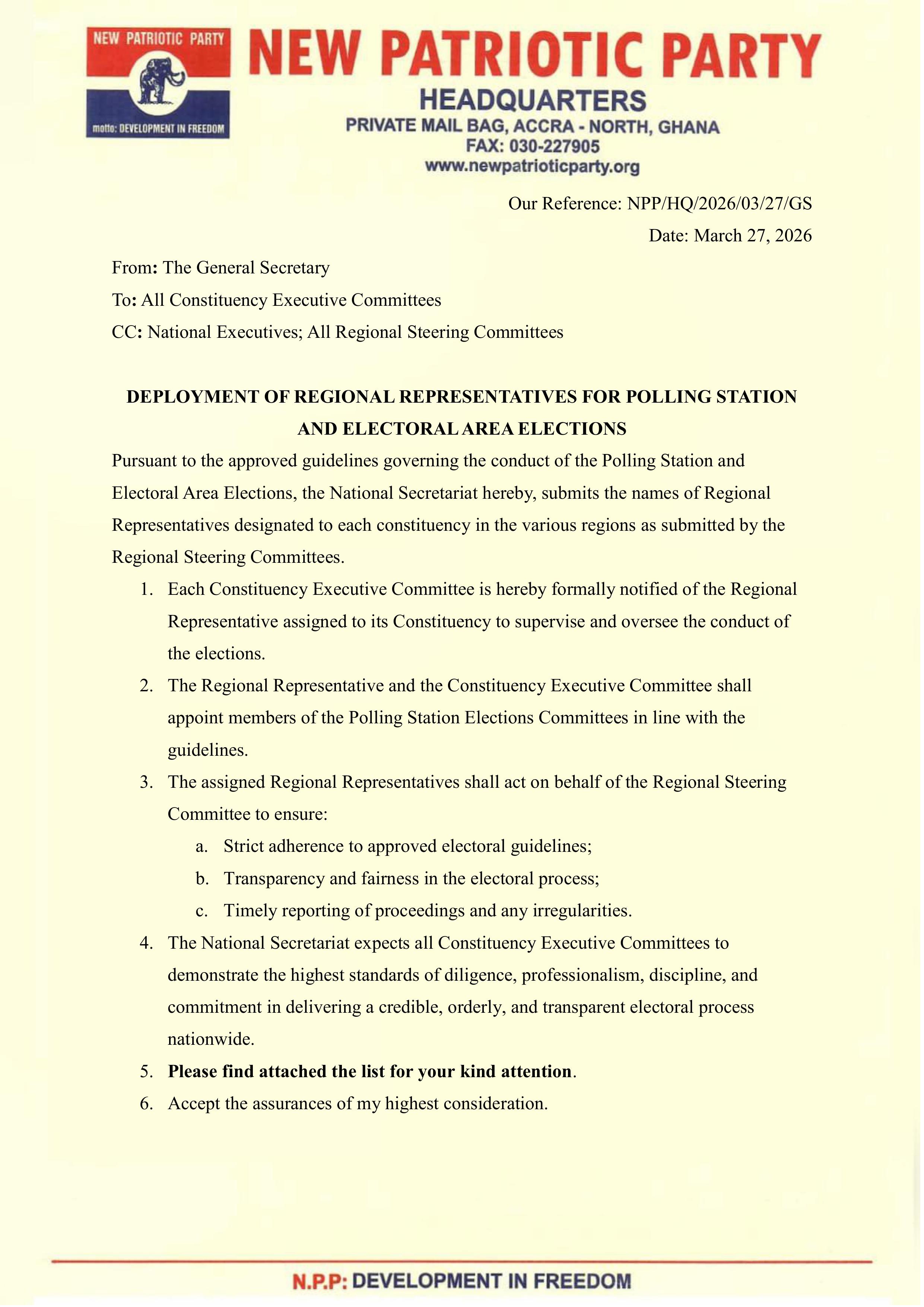 The National Secretariat of the New Patriotic Party has announced the deployment of regional representatives to constituencies across the country to oversee the upcoming polling station and electoral area elections.