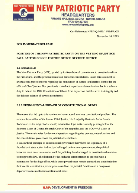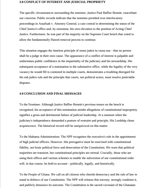The NPP also expressed concern about a potential conflict of interest, noting that Justice Baffoe-Bonnie previously presided over proceedings connected to the very case that enabled his current nomination.