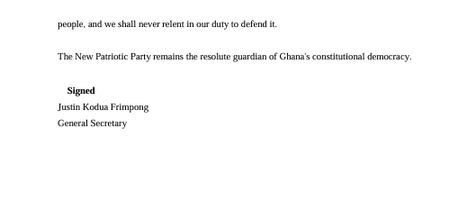 The party concluded by reaffirming its commitment to defending the 1992 Constitution, stating that it “will never relent in its duty to safeguard Ghana’s democracy and the rule of law.”