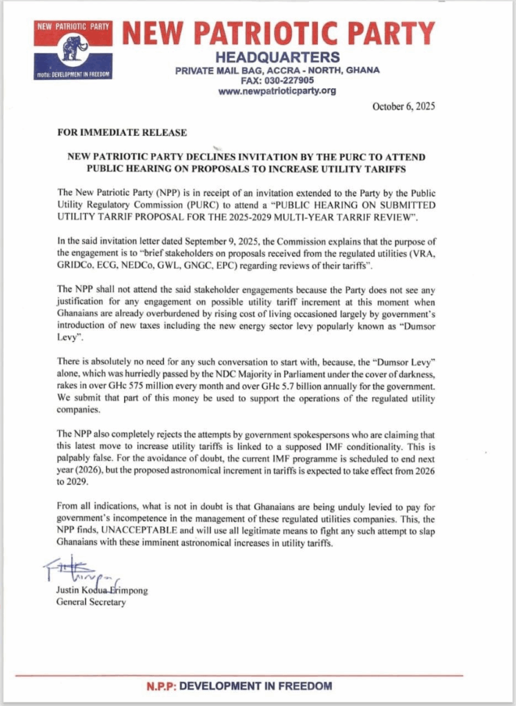 The New Patriotic Party (NPP) has declined an invitation from the Public Utilities Regulatory Commission (PURC) to participate in a public hearing on proposed utility tariff adjustments for the 2025–2029 period.