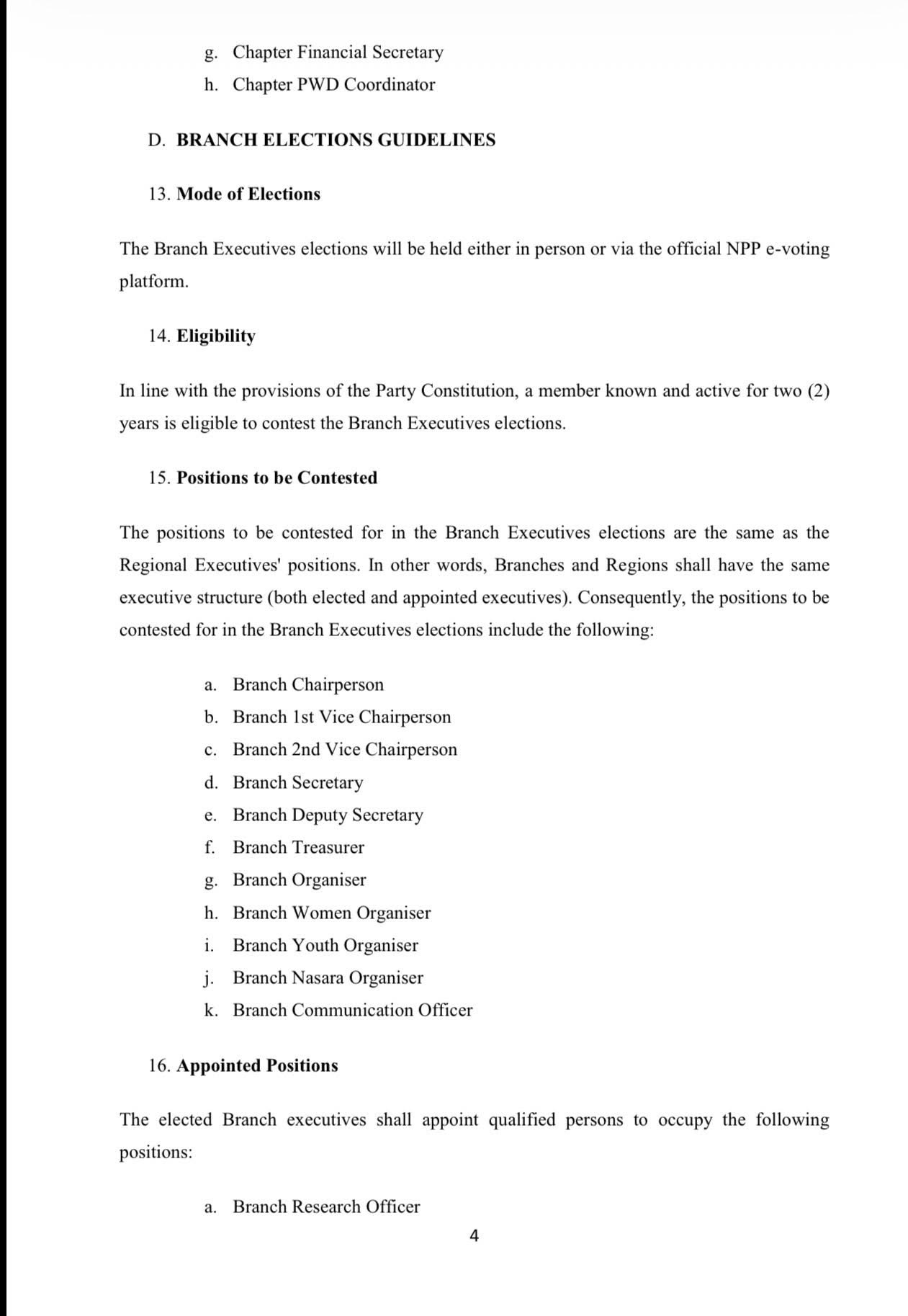 The document further details the structure and composition of executives at different levels. At the branch level, positions to be contested include Chairperson, Vice Chairpersons, Secretary, Treasurer, Organiser, Women’s Organiser, Youth Organiser, Nasara Organiser, and Communications Officer, among others.