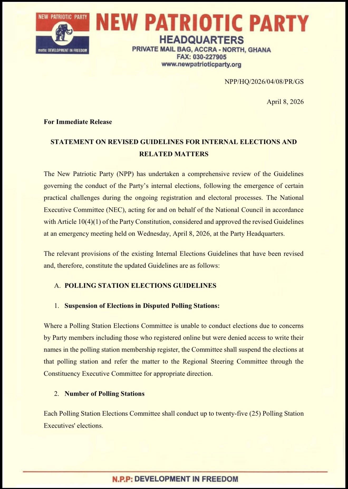 The New Patriotic Party (NPP) has announced revised guidelines to govern its internal elections, introducing key changes aimed at strengthening transparency, inclusiveness, and internal democracy.