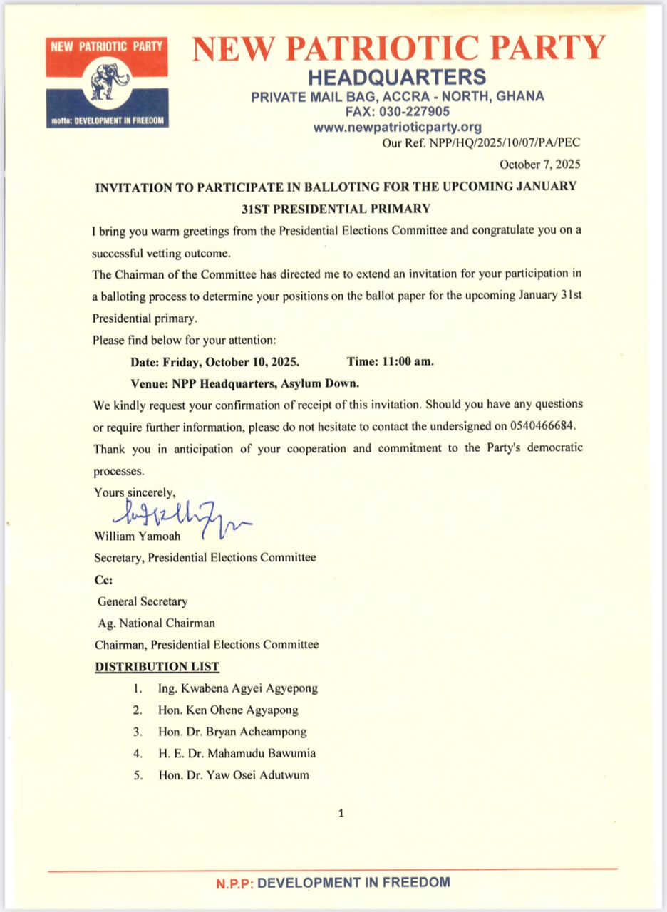 The New Patriotic Party (NPP) has scheduled Friday, October 10, 2025, for the balloting of positions on the ballot paper for its upcoming Presidential Primary slated for January 31, 2026.
