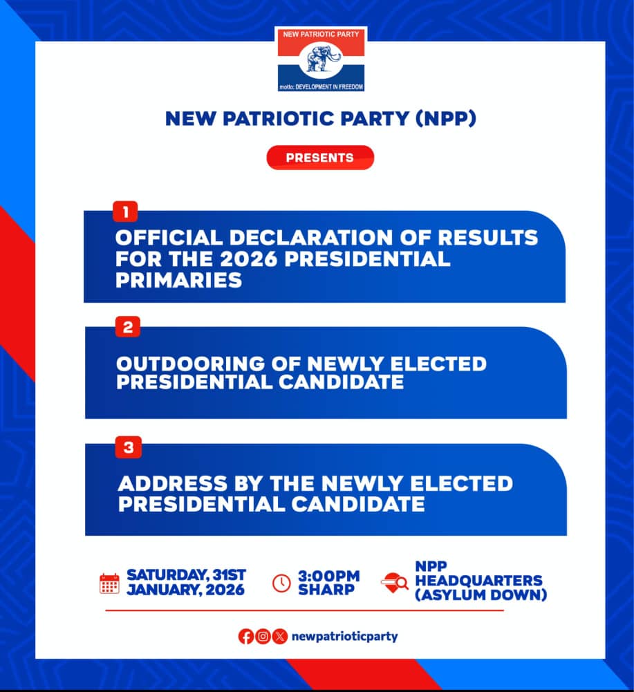 The New Patriotic Party (NPP) is set to officially declare the outcome of its 2026 presidential primaries and formally present its newly elected flagbearer on Saturday, January 31, 2026.