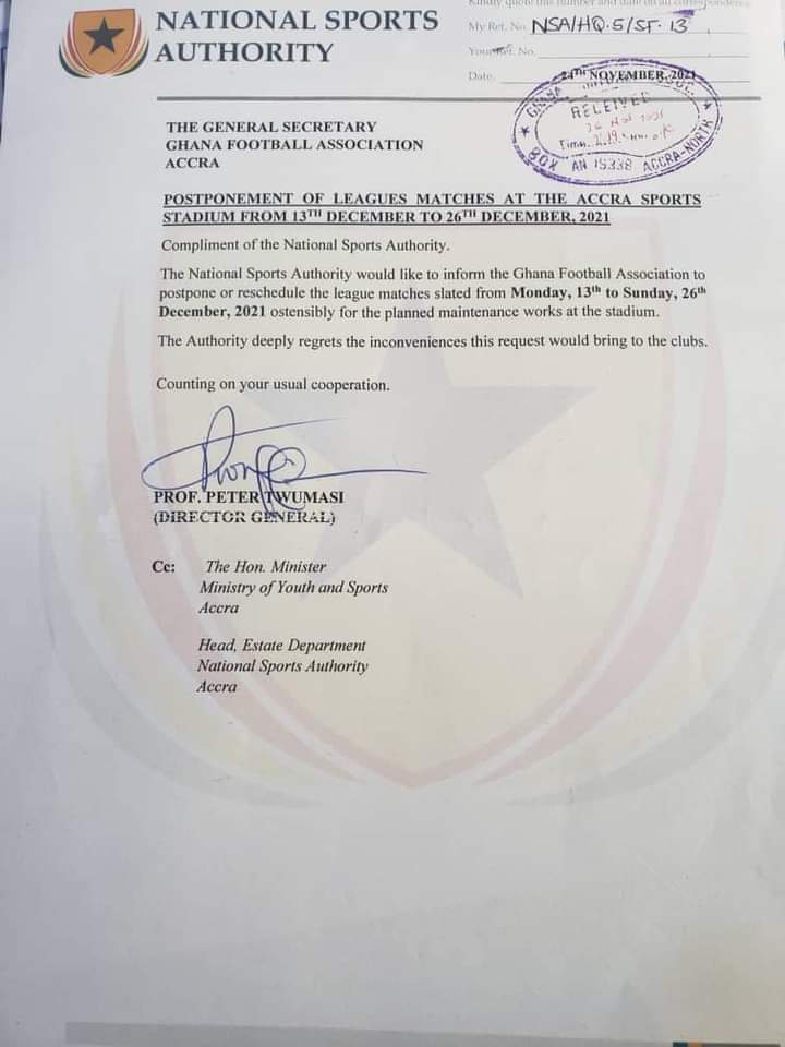 In view of this, the NSA have ordered the Ghana Football Association to postpone the Premier League games to be held at the venue on the said dates, their statement indicated the closure is to enable the NSA and Ministry of Youth and Sports to have enough and uninterrupted time to fix critical places of the stadium.
