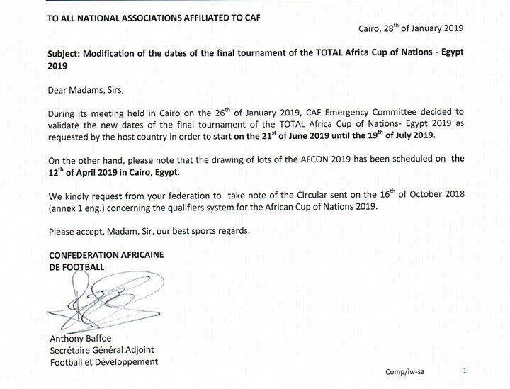 Africa’s supreme football governing body, CAF, has changed the dates for the kick-off of the 2019 Egypt Africa Cup of Nations.