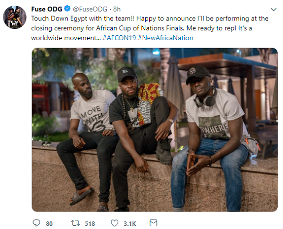 UK-based Ghanaian Singer, Fuse ODG will perform at the closing ceremony of the 2019 Africa Cup of Nations.
