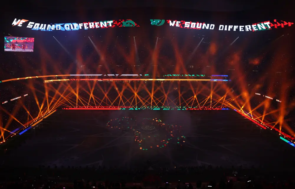 Performers moved in carefully choreographed patterns across a pitch transformed by colour and light, reflecting the continent’s diversity and football heritage.