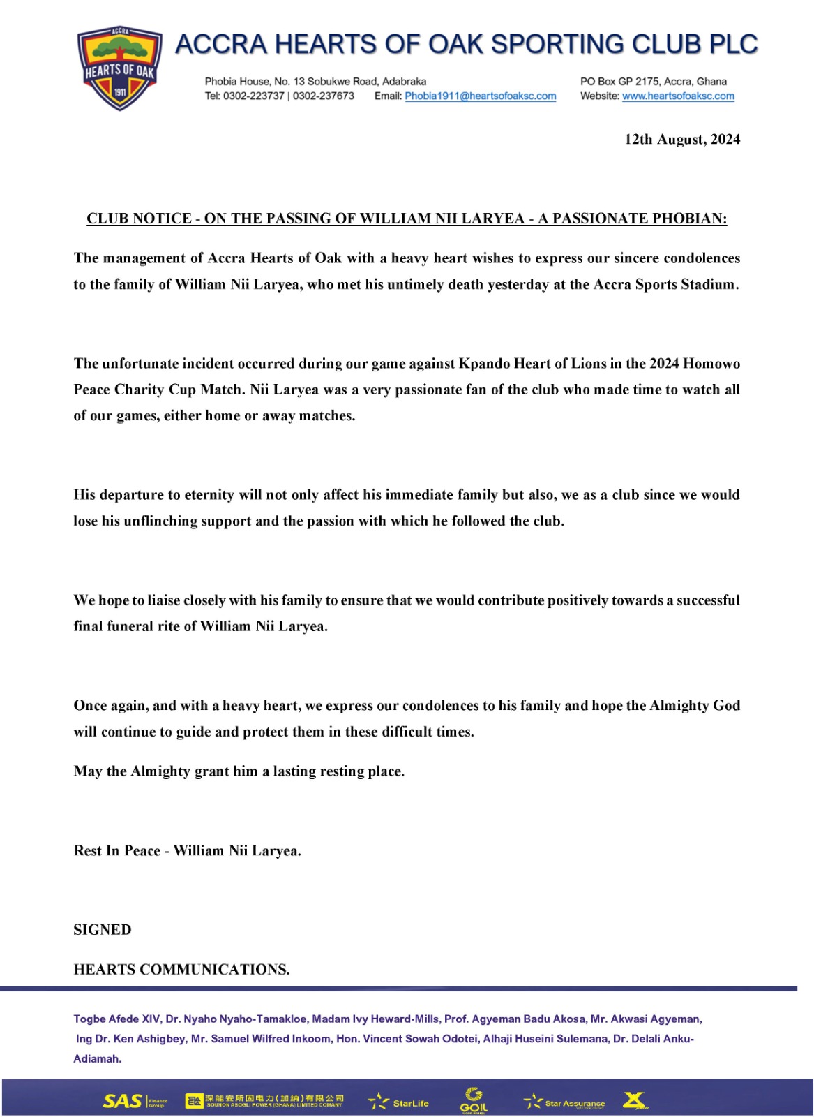Accra Hearts of Oak have mourned the death of William Nii Laryea, a fan who died during their 2024 Homowo Charity Cup match against Heart of Lions at the Accra Sports Stadium on Sunday.