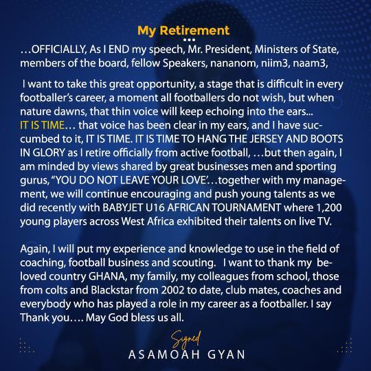 In his statement, Gyan said he plans to continue working in football after his retirement.