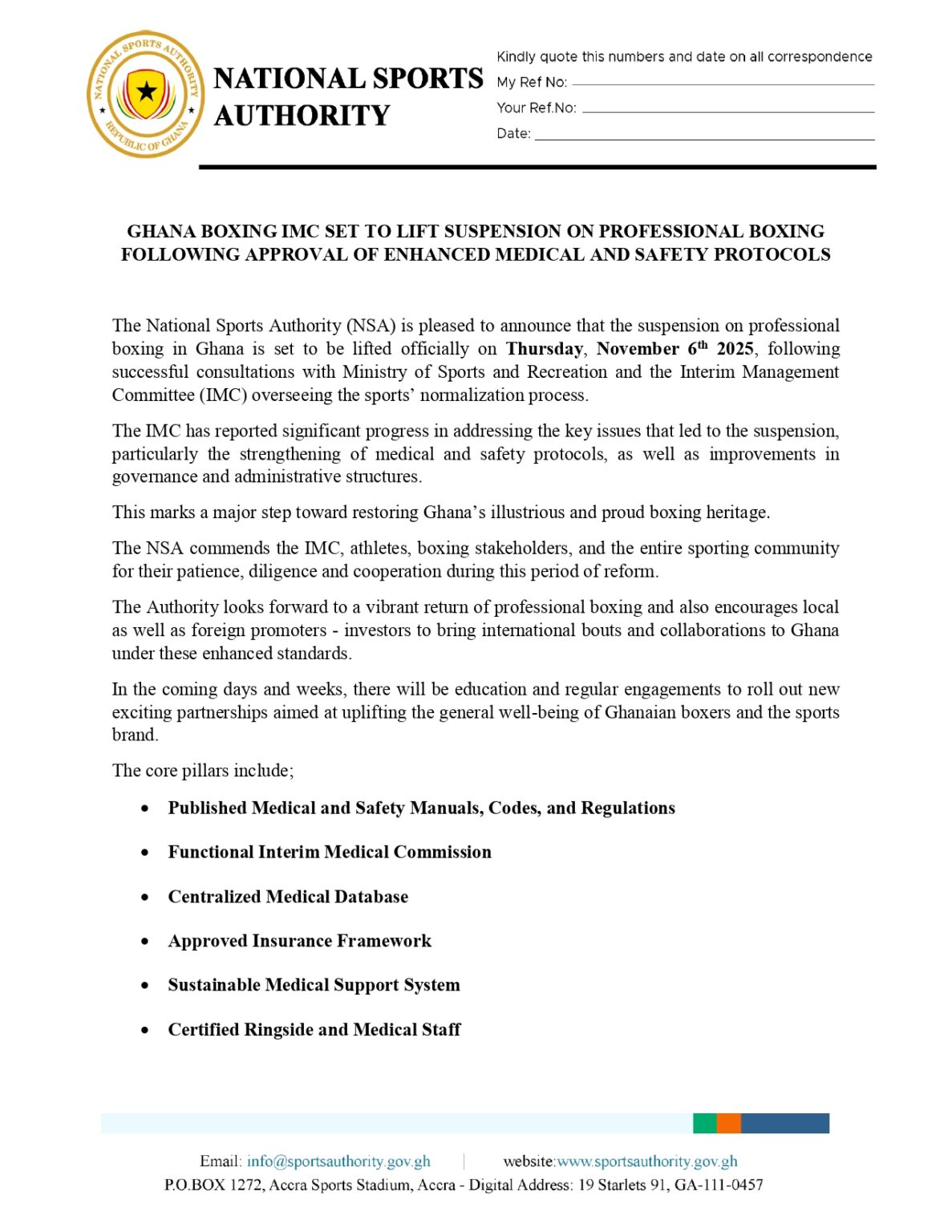 The National Sports Authority (NSA) has lifted the suspension on professional boxing in Ghana, effective Thursday, November 6, 2025.