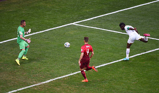 BRASILIA, BRAZIL – JUNE 26: Asamoah Gyan of Ghana scores his team’s first goal past goalkeeper Beto of Portugal during the 2014 FIFA World Cup Brazil Group G match between Portugal and Ghana at Estadio Nacional on June 26, 2014, in Brasilia, Brazil. (Photo by Christopher Lee/Getty Images)