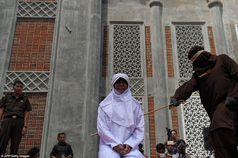 In the photos, while one of the women is seen crying as a hooded man metes out lashings with a rattan (bamboo) cane on a stage next to the mosque in front of a large, cheering crowd, a man is seen standing as he receives the same brutal punishment.Â